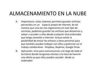 Este documento presenta varias herramientas digitales y sus aplicaciones. Describe el almacenamiento en la nube para guardar archivos en línea y compartirlos, presentaciones como PowerPoint para crear materiales de marketing y capacitación, documentos en línea para compartir información, audio y video en plataformas como YouTube para promocionar empresas, podcasts para difundir contenido multimedia, notas virtuales como Evernote para organizar información, aulas virtuales para cursos en línea, y fotografía e infografías para generar contenido visual e informes.