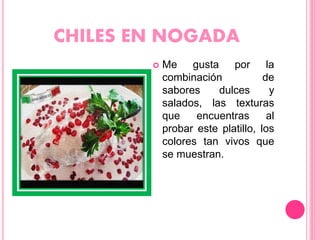 Este documento describe tres platillos favoritos del autor: chiles en nogada, tacos de camarón con salsa de huitlacoche y chapulines, y sopa azteca. El autor aprecia los chiles en nogada por la combinación de sabores dulces y salados y las texturas, los tacos de camarón por la mezcla de mar y tierra y el sabor a camarón con mayonesa, y la sopa azteca por la combinación de texturas crujientes y blandas y su sabor picante.