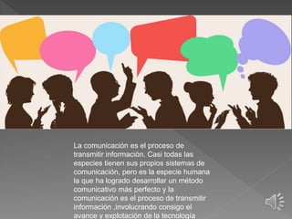 El documento describe la evolución de la comunicación desde los primeros métodos primitivos utilizados por los antepasados humanos hasta los avances tecnológicos modernos. Comenzó con señales no verbales y sonidos de animales, luego se desarrollaron métodos como señales de humo, jeroglíficos y el heliógrafo. Más tarde surgieron la imprenta, las palomas mensajeras, el telégrafo, el teléfono, la radio y la televisión. Los ordenadores y teléfonos móviles revolucionaron la