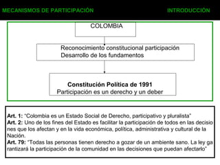 El documento introduce los mecanismos de participación ciudadana ambiental reconocidos constitucionalmente en Colombia y desarrollados en la Ley 99 de 1993, como las audiencias públicas, consulta a comunidades y derecho de petición de información ambiental. Explica también mecanismos judiciales como la acción de tutela, acción de cumplimiento y acción de grupo para la protección de derechos ambientales.