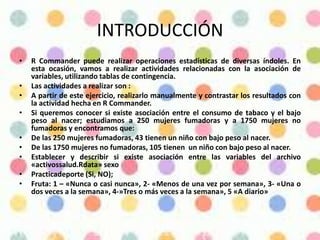 Este documento describe cómo realizar análisis de tablas de contingencia y asociación entre variables usando R Commander. Incluye un ejemplo sobre la asociación entre el consumo de tabaco y el bajo peso al nacer en mujeres, el cual es analizado manualmente y luego en R Commander. También presenta un segundo ejercicio sobre determinar la asociación entre variables como sexo, práctica de deporte y consumo de fruta usando datos de un archivo en R.