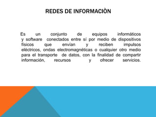 Este documento describe las redes de información, incluyendo sus tipos (LAN y WAN), ventajas (compartir información y recursos desde cualquier lugar), y partes fundamentales (hub, tarjeta de interfaz de red, cables). También cubre aplicaciones como correo electrónico y videoconferencia, y tipos de redes cliente-servidor como Ethernet. Finalmente, explica el correo electrónico y los servicios disponibles en Internet como información, entretenimiento y compras.