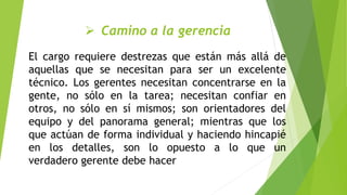 El documento resume ideas clave del libro "Gerente por primera vez" sobre los desafíos de ser un nuevo gerente. Algunos puntos clave son que los gerentes deben enfocarse en las personas y no solo en las tareas, delegar responsabilidades, y establecer comunicación abierta con los subordinados para resolver problemas pequeños e irritantes. También destaca la importancia de mantener la calma ante situaciones difíciles para pensar con claridad y tomar buenas decisiones.