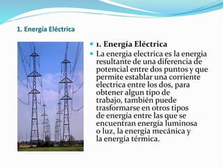 El documento describe 23 tipos de energía, incluyendo la energía eléctrica, lumínica, mecánica, térmica, eólica, solar, nuclear, cinética, potencial, química, hidráulica, sonora, radiante, fotovoltaica, de reacción, iónica, geotérmica, mareomotriz, electromagnética, metabólica, hidroeléctrica, magnética y calorífica. Cada tipo se define brevemente en uno o dos párrafos.