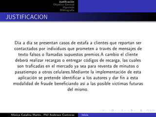 Este documento presenta una justificación, objetivo general e hipótesis para un proyecto que busca prevenir fraude a usuarios a través del seguimiento de recargas en Comcel S.A. El objetivo es identificar líneas beneficiadas por recargas fraudulentas para prevenir casos futuros. La hipótesis plantea que el fraude implica tres etapas: carga por engaño, pasatiempo y tráfico de la línea fraudulenta.