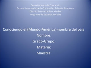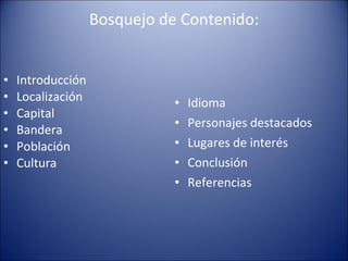 Este documento presenta un plan de estudios sociales sobre Puerto Rico. Incluye una introducción sobre el contenido y una sección de bosquejo con subsecciones sobre la localización, capital, bandera, población, cultura, idioma, personajes destacados y lugares de interés de Puerto Rico. También incluye una conclusión, referencias y criterios de evaluación.