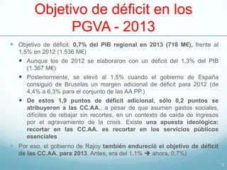 Los PGVA-2013 suponen mayores recortes que afectarán a los servicios públicos fundamentales como sanidad, educación y políticas sociales. Se recortarán 1.352 millones en sanidad y 462 millones en educación con respecto a 2010. Además, el servicio de la deuda se convertirá en la tercera partida presupuestaria más alta, lo que limitará aún más el margen de maniobra de la Generalitat. Estos presupuestos muestran que el gobierno de Rajoy ha ignorado los problemas derivados del modelo de financiación de la