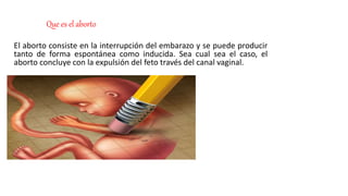 El aborto es la interrupción del embarazo, que puede ser espontáneo o inducido, y conlleva la expulsión del feto. Existen distintos métodos de aborto quirúrgico, como la aspiración con vacío y la dilatación y evacuación, cada uno con riesgos asociados para la salud de la mujer. En Colombia, la interrupción voluntaria del embarazo es reconocida como un derecho fundamental, garantizando la confidencialidad y la protección de las mujeres que soliciten este procedimiento.