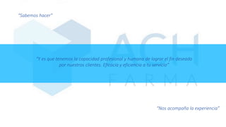 ACH Farma es una empresa mexicana líder en servicios de ingeniería y proyectos farmacéuticos, especializada en climatización y cuartos limpios. Se enfoca en satisfacer las necesidades de sus clientes mediante excelencia, efectividad y lealtad, cumpliendo con las normativas nacionales e internacionales. Ofrece una amplia gama de servicios, incluyendo diseño, construcción y puesta en marcha de instalaciones industrial, apoyándose en una colaboración estrecha con empresas especializadas.