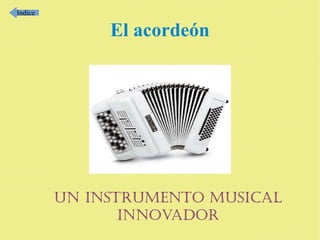 Este documento presenta la historia, evolución y actualidad del acordeón. Explica que el acordeón se originó en Polonia y Austria en el siglo XIX y ha evolucionado desde un simple instrumento de lengüetas hasta convertirse en un instrumento musical complejo. Además de destacar compositores clásicos y modernos, el documento señala que aunque a menudo se considera un instrumento callejero, el acordeón también se usa en bandas sonoras de películas y canciones populares.