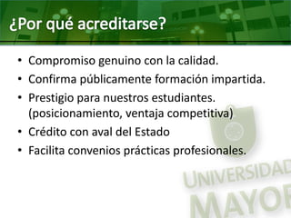El documento describe el proceso de acreditación de carreras en la Universidad Mayor. Explica las etapas de autoevaluación interna realizada por el cuerpo académico, la evaluación externa llevada a cabo por pares evaluadores, y la visita de estos últimos para revisar la documentación y realizar entrevistas con los involucrados en la carrera. El objetivo final es que la agencia certifique que la carrera cumple los estándares de calidad requeridos.