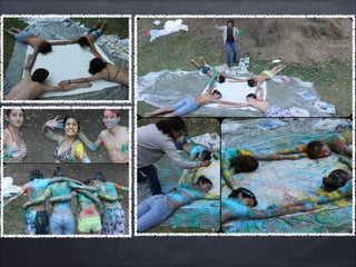Este documento describe varios proyectos de "Action Painting" realizados por equipos de estudiantes. Algunos equipos pintaron en grandes telas para tener libertad de movimiento, usando acrílicos en lugar de pinturas tóxicas. Otros equipos pintaron con partes de su cuerpo como forma de expresión, mientras que otro equipo usó plantillas de cinta adhesiva para dejar un mensaje. El documento elogia la creatividad e intención de los estudiantes en sus diversos enfoques para este proyecto de pintura de acción.