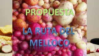 Este documento trata sobre el melloco, una tubérculo andino rico en vitaminas. Se cultiva principalmente en las provincias ecuatorianas de Tungurahua, Cotopaxi y Chimborazo. El melloco se usa comúnmente en la gastronomía andina y en platos tradicionales como la fanesca, la tonga y ensaladas. Además, tiene usos medicinales como curar úlceras, facilitar el parto y tratar problemas de la piel. El documento propone una ruta turística para prom
