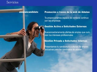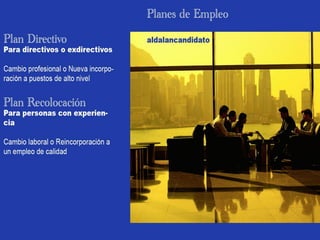 Este documento describe los planes de empleo e inserción social para personas sin estudios o en riesgo de exclusión social, incluyendo entrenamiento de habilidades socio-laborales y búsqueda de empleo. Más de 6000 empresas colaboran proporcionando más de 15,000 ofertas de empleo anualmente, y las estadísticas muestran que siguiendo los pasos detallados, el grado de inserción laboral en 4-7 meses asciende al 85%.