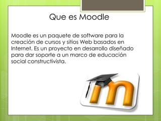Moodle es un software de código abierto para crear cursos y sitios web educativos. Permite a los profesores crear actividades como cuestionarios, foros, glosarios y bases de datos para que los estudiantes interactúen y colaboren. Moodle promueve un marco constructivista social y puede usarse para cursos en línea o como complemento de cursos presenciales.