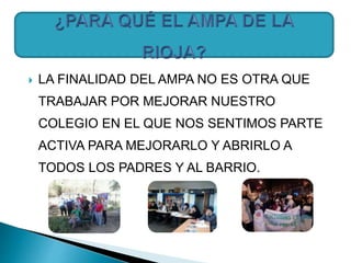 El documento describe las actividades y objetivos de un AMPA (Asociación de Madres y Padres de Alumnos) para mejorar su colegio. El AMPA organiza actividades extraescolares deportivas, artísticas y de enriquecimiento, así como talleres para padres y eventos para involucrar a la comunidad. El AMPA se reúne mensualmente y coordina regularmente con el equipo directivo del colegio para mejorarlo desde adentro y aportar propuestas creativas.