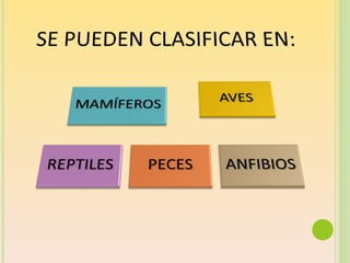 El documento describe las principales clases de animales, incluyendo mamíferos, aves, reptiles, peces y anfibios. Los mamíferos se caracterizan por ser vivíparos y amamantar a sus crías, mientras que las aves ponen huevos y tienen plumas y alas. La mayoría de los reptiles son carnívoros y tienen el cuerpo escamado, y los peces tienen escamas y aletas para nadar. Los anfibios ponen huevos y tienen la piel desnuda y húmeda.