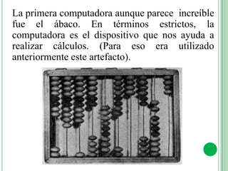 El ábaco fue la primera computadora para realizar cálculos. Charles Babbage concibió la idea de una máquina analítica programable en la década de 1830 pero no pudo construirla. Konrad Zuse inventó la Z1, la primera computadora programable moderna, en 1936. En 1946 se construyó la ENIAC, la primera computadora electrónica de propósito general, aunque era enorme y solo podía realizar una tarea a la vez.