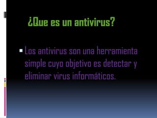 El documento describe diferentes tipos de antivirus, incluyendo escáneres que detectan virus conocidos, escáneres heurísticos que detectan virus desconocidos, y drivers virtuales que constituyen el principal elemento de los antivirus modernos. Luego menciona varios programas antivirus populares como Norton Antivirus, Avast, AVG Anti-Virus, Avira, BitDefender y McAfee VirusScan.
