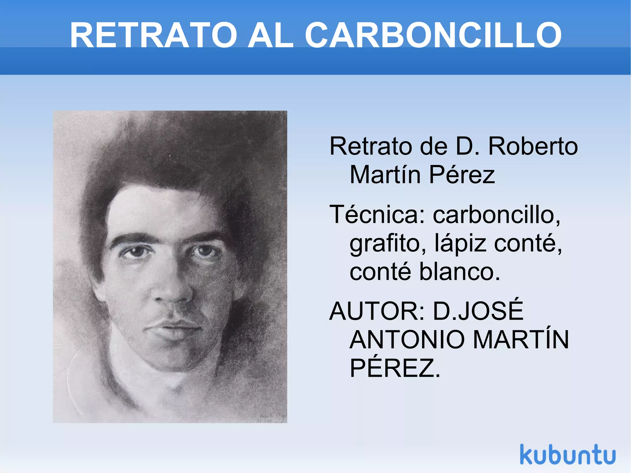 El documento describe dos obras de arte: un retrato al carboncillo de D. Roberto Martín Pérez realizado con técnicas de carboncillo, grafito y lápiz conté; y una escultura de bronce titulada "Retrato de Álvaro" realizada por D. José Antonio Martín Pérez.