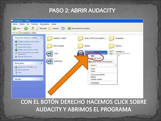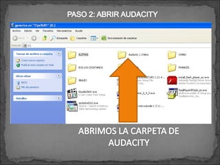 El documento proporciona instrucciones para grabar audio usando un software de edición. Explica cómo conectar un micrófono, iniciar una grabación, pausar o cambiar de pista cuando cambia el hablante, y exportar la grabación final a un archivo de audio para almacenarlo.