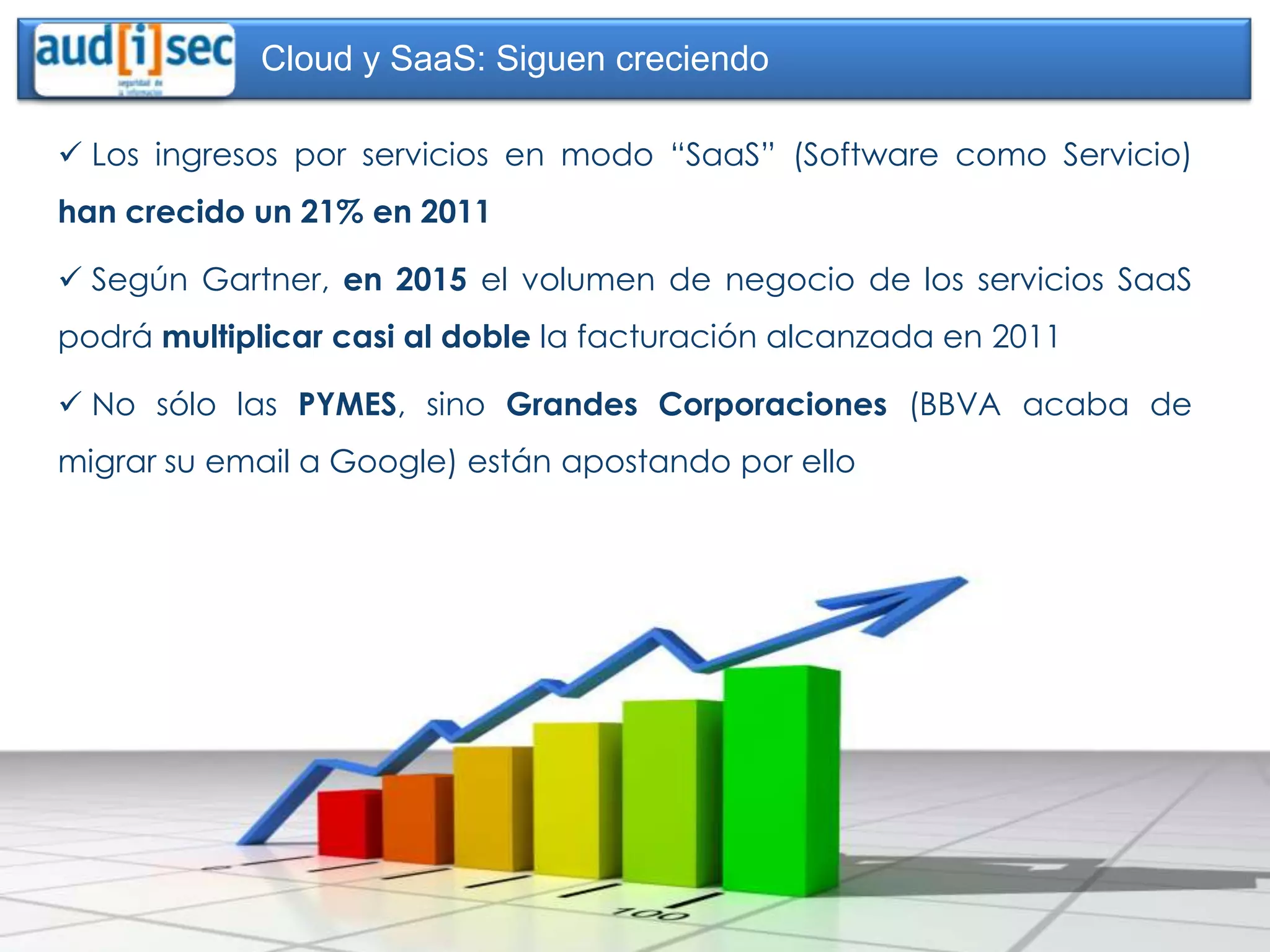 El documento habla sobre la creciente confianza en los servicios en la nube y SaaS. Sin embargo, aún existen preocupaciones sobre la seguridad y el control de la información cuando se externalizan servicios. Los estándares internacionales como ISO 27001, ISO 20000 y BS 25999 pueden ayudar a generar confianza al asegurar la seguridad, gestión y continuidad de los servicios en la nube. La plataforma GlobalSUITE ofrece una solución SaaS certificada conforme a estos estándares para gestionar sistemas de gest