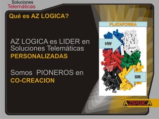 Este documento presenta a AZ LOGICA, una compañía líder en soluciones telemáticas personalizadas. Describe algunas de las necesidades del mercado que pueden satisfacerse mediante la telemática, como el control de flotas, la agricultura de precisión y la supervisión en la industria del petróleo. Explica brevemente cómo funciona un sistema de telemetría genérico y los tipos de variables que puede medir y controlar a través de la telemática. Finalmente, destaca las ventajas competitivas de AZ LOGICA, como su en
