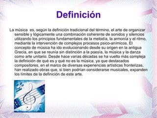 El documento define la música como el arte de organizar sonidos y silencios usando principios como la melodía, armonía y ritmo. Luego, explica que la definición de música ha evolucionado e incluye obras que expanden los límites tradicionales. Finalmente, lista diferentes tipos de música como rock, pop, reggaetón y flamenco.