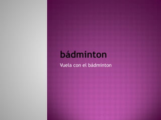 El documento proporciona información sobre el deporte del bádminton. Explica que es un deporte de raqueta entre dos jugadores o parejas separados por una red, con el objetivo de enviar el volante al campo contrario. Describe los elementos básicos como la raqueta, el volante, la cancha rectangular y la red. Brevemente resume los orígenes del bádminton en la India y su llegada a Inglaterra, así como su inclusión en los Juegos Olímpicos desde 1992.