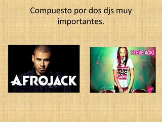 El documento describe a dos DJs importantes que se unieron para crear música, incluyendo una canción muy conocida que los caracteriza, y también crearon una bebida energética llamada AFROKI. Los DJs se destacan por sus actuaciones en festivales, colaboraciones y composiciones aclamadas, además de ser grandes amigos a pesar de su exitosa unión profesional.