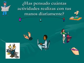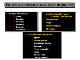El documento habla sobre los accidentes comunes en el trabajo y las lesiones en las manos. Explica que las principales causas de accidentes son la imprudencia, ignorancia y descuido. Además, las lesiones en las manos representan el 46.2% de los casos de incapacidad permanente. Finalmente, enfatiza la importancia de usar guantes para prevenir quemaduras y otros daños a las manos causados por químicos, altas temperaturas y riesgos mecánicos.