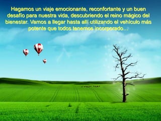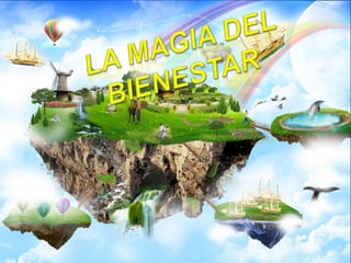 Este documento describe varias técnicas para lograr el bienestar, como la aromaterapia, meditación, visualización y rutinas diarias. Explica que mediante los sentidos y la "conciencia sensorial" se puede acceder a un estado de calma, control y felicidad. Además, proporciona ejemplos detallados de cómo aplicar estas técnicas a través de rutinas y actividades diarias centradas en la relajación, desintoxicación y energía.