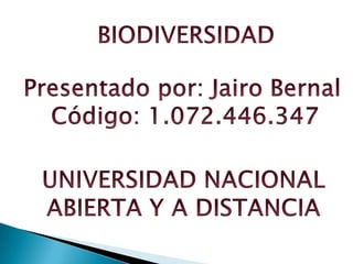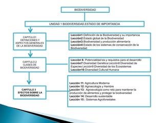 Este documento presenta una guía de aprendizaje sobre la biodiversidad dividida en tres unidades. La primera unidad define la biodiversidad y explica su importancia para la producción de alimentos y los sistemas de conservación. La segunda unidad se enfoca en las comunidades vegetales, su clasificación y distribución. La tercera unidad examina los peligros que amenazan la flora y la fauna silvestre, como la extinción de especies y los transgénicos. Cada unidad contiene varios capítulos con lecciones sobre estos temas