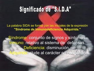 El documento define SIDA como la etapa avanzada de infección por el VIH, que ataca las defensas del organismo. Se transmite a través de la sangre, fluidos sexuales y de madre a hijo. Se previene usando condones durante relaciones sexuales y esterilizando equipos de inyección. Un análisis de sangre detecta los anticuerpos producidos en respuesta al VIH. A nivel mundial, 33 millones viven con VIH, la mayoría en África subsahariana, y 1.8 millones murieron de SIDA en