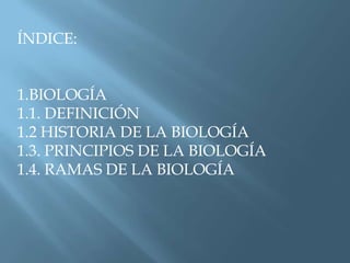 Este documento presenta una introducción a la biología. Define la biología como la ciencia que estudia la vida. Brevemente describe la historia de la biología y cómo el término fue acuñado en el siglo XVIII. Luego, enumera algunos de los principios fundamentales de la biología como la evolución, diversidad y continuidad. Finalmente, lista y describe varias de las ramas principales de la biología como la anatomía, ecología, genética y fisiología.