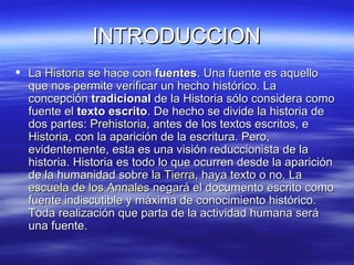 El documento discute la clasificación de las fuentes históricas, dividiéndolas en primarias, secundarias y terciarias, y resalta la importancia de todas ellas en la construcción de la historia. Se señala que las fuentes primarias son material de primera mano, mientras que las secundarias son análisis basados en las primeras; las terciarias compilan ambas. El texto también enfatiza la crítica y el contraste de fuentes como pasos fundamentales en la investigación histórica.