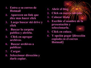 Para subir una diapositiva en un blog, se deben seguir los siguientes pasos: 1) Entrar al correo de Hotmail y hacer clic en el enlace "más"; 2) Buscar la carpeta pública de Google Drive y cargar el archivo allí; 3) Copiar la dirección del archivo desde Google Drive; 4) Crear una nueva entrada de blog, pegar la dirección del archivo y publicar la entrada.