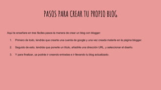 Crear un blog con Blogger requiere tres pasos: 1) crear una cuenta de Google y acceder a Blogger, 2) darle un título, URL y diseño al blog, 3) empezar a crear entradas para mantener actualizado el blog.