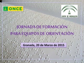 La jornada de formación para equipos de orientación se llevará a cabo en Granada el 20 de marzo de 2015. Los equipos de orientación están compuestos por maestros, psicólogos, trabajadores sociales, animadores socioculturales, técnicos en integración laboral y técnicos deportivos. La jornada cubrirá temas como la composición de los equipos, las zonas de intervención, los tipos de intervención como apoyo directo y seguimiento, las áreas de intervención como el desarrollo evolutivo y la autonomía,