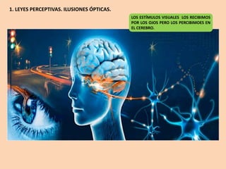 Este documento presenta diferentes conceptos relacionados con la percepción visual y la comunicación audiovisual. Explica las leyes perceptivas y las ilusiones ópticas, los niveles de iconicidad de una imagen, el análisis del significante y significado, y diferentes tipos de comunicación audiovisual como la imagen fija y en movimiento. También describe elementos del lenguaje del cómic como las viñetas y globos, y recursos expresivos del cine como los tipos de planos, encuadres y movimientos de cámara.