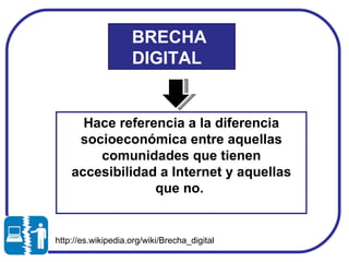 El documento discute el concepto de brecha digital, que se refiere a la diferencia entre aquellos que pueden beneficiarse de la tecnología digital y aquellos que no. Explora los diferentes tipos de brechas digitales y ofrece estadísticas sobre la brecha digital en Colombia, donde el acceso a Internet está altamente concentrado en los estratos socioeconómicos más altos. También propone estrategias para reducir la brecha digital en Colombia, como la inversión gubernamental en infraestructura y subsidios para el acceso a Internet para los estratos baj