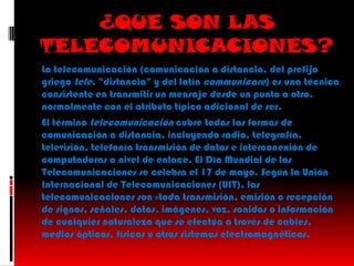 Las telecomunicaciones implican la transmisión de señales a distancia para lograr la comunicación entre un transmisor y un receptor a través de cables, medios ópticos u otros sistemas electromagnéticos. Incluyen formas como la telefonía, radio, televisión y computación. Los elementos básicos son un transmisor que convierte la información en señal, un medio de transmisión que transporta la señal, y un receptor que reconvierte la señal en información. Las telecomunicaciones han sido importantes para el desarrollo humano