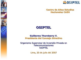 El documento describe las funciones y actividades del OSIPTEL, el organismo regulador de las telecomunicaciones en Perú. El OSIPTEL mantiene la competencia entre proveedores, regula tarifas e interconexión, supervisa calidad y cumplimiento contractual, resuelve disputas y reclamos de usuarios. Además, el documento resume el crecimiento del sector de telecomunicaciones en Perú en términos de ingresos, líneas móviles y fijas, cobertura, acceso a internet, inversión e índices de precios.