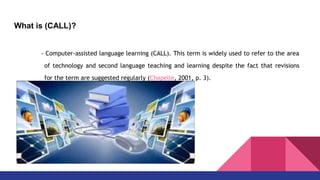 Este documento describe el aprendizaje de lenguas asistido por computadora (ALAC), incluyendo sus etapas evolutivas (conductista, comunicativa e integral) y los roles de la tecnología, profesor y alumno. Define ALAC como el área de enseñanza y aprendizaje de segundas lenguas con tecnología a pesar de sugerencias regulares para revisar el término.