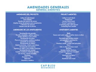 El documento describe un proyecto inmobiliario llamado Cap Bleu ubicado cerca de servicios como centros comerciales, supermercados, cines y restaurantes. El proyecto construirá bloques de edificios C, D y E en una primera fase que tomará 16 meses a partir de octubre de 2009. El documento proporciona contactos para obtener más información sobre las oportunidades disponibles en Cap Cana.