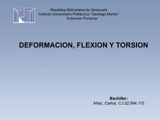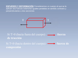Este documento describe los conceptos de esfuerzo, deformación, flexión, torsión, tracción y compresión en ingeniería mecánica. Explica que el esfuerzo es la fuerza aplicada por unidad de área y que puede ser de tracción, compresión, corte, flexión u torsión. También define la deformación unitaria y elástica vs. plástica. Finalmente, señala que en torsión el giro de un cuerpo no es uniforme sino que varía linealmente con la longitud.