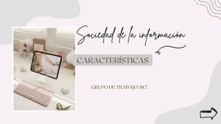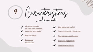 La sociedad de la información se caracteriza por (1) alcanzar a todos los sectores de la sociedad como la cultura, economía e industria, (2) requerir aprender de manera continua debido a la velocidad del cambio, y (3) girar en torno a las tecnologías de la información y la comunicación que impulsan la innovación pero también generan exceso de información.