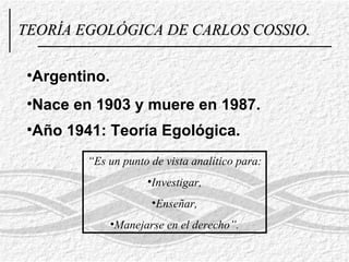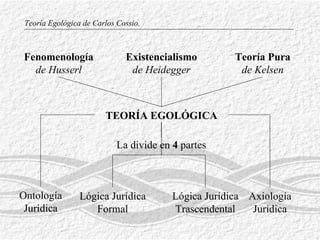La teoría egológica de Carlos Cossio propone que el derecho debe estudiarse como una conducta humana en interferencia intersubjetiva en lugar de centrarse en las normas. Divide su teoría en cuatro partes: la ontología jurídica define el derecho como una conducta cultural; la lógica jurídica formal analiza la validez y estructura lógica de las normas; la lógica jurídica trascendental interpreta la conducta, no la norma, de forma empírico-dialéctica; y