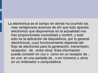 La electrónica ha experimentado avances rápidos que han mejorado la comodidad y el confort mediante dispositivos electrónicos que dependen del flujo de electrones para procesar y transmitir información como voz, imágenes, números u otros datos. Los circuitos electrónicos pueden amplificar señales débiles, generar ondas de radio, extraer información de señales y realizar operaciones lógicas como en las computadoras. Los ingenieros electrónicos tienen muchas oportunidades laborales en empresas de comunicaciones, industria, energía, petróleo,