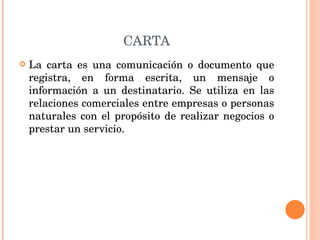 La carta es un documento escrito que se utiliza para comunicar información o un mensaje a un destinatario. Contiene elementos como el número de consecutivo, fecha, datos del destinatario, asunto, saludo, texto, despedida y remitente. Debe tener un formato y estilo definidos, como márgenes, fuentes y distribución de la información. Se usa principalmente para comunicaciones comerciales entre empresas o personas.
